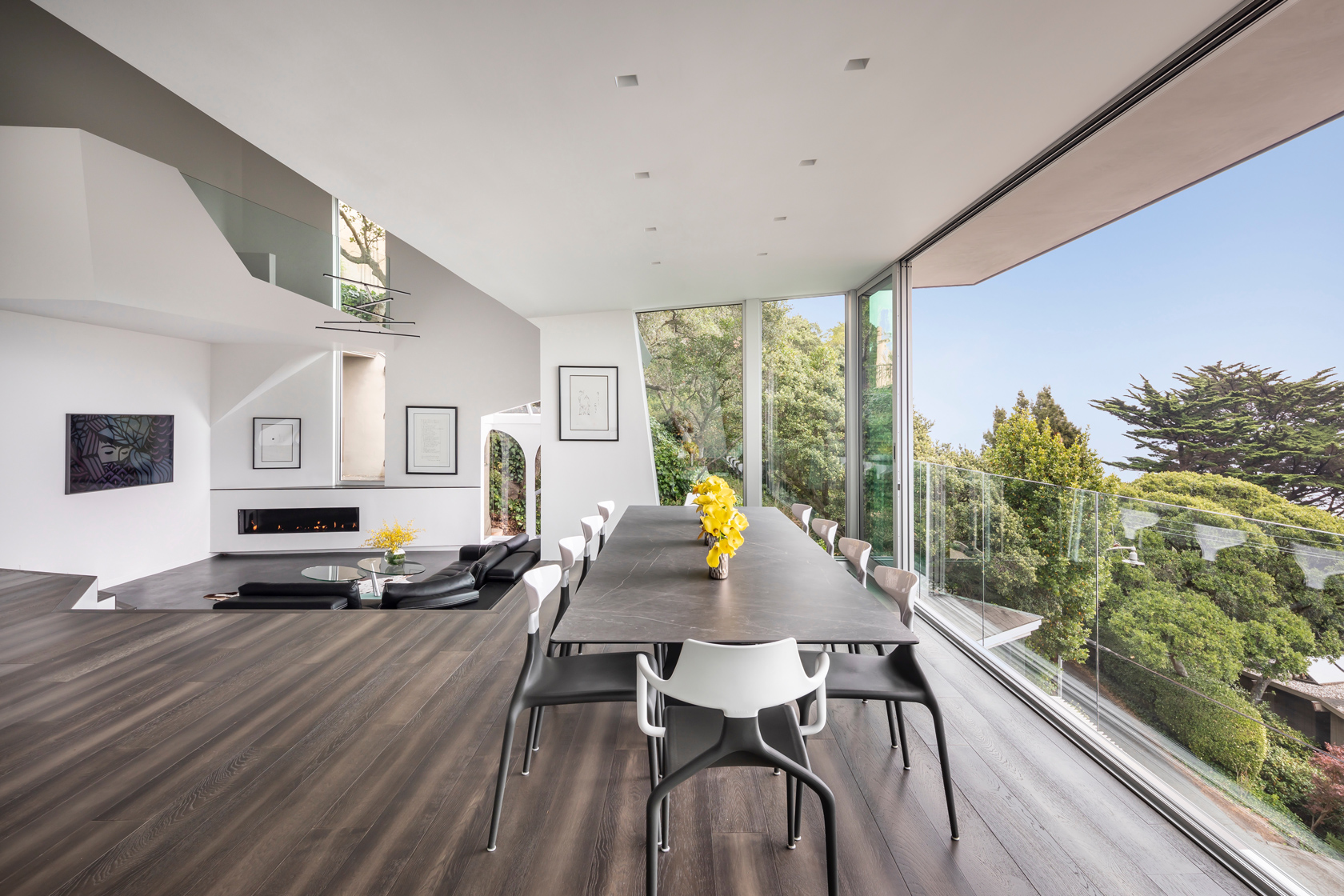 Two changes guided the project. The solarium covered deck came down, and we introduced a roofline that reaches out and up to gather both views and light. In hillside homes overlooking the Bay, a surprising amount of light comes from reflection off the water. By tilting the roofline, we were able to pull that light deep into the main space. We then pulled the deck itself into the interior and lined it with sliding glass, creating an indoor deck that now holds a long dining table.