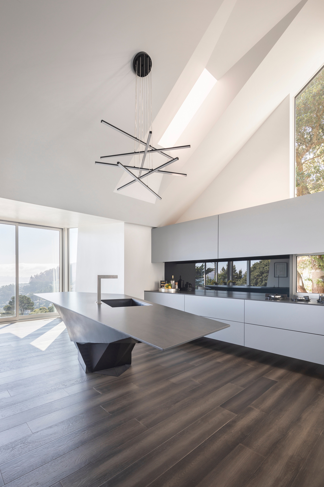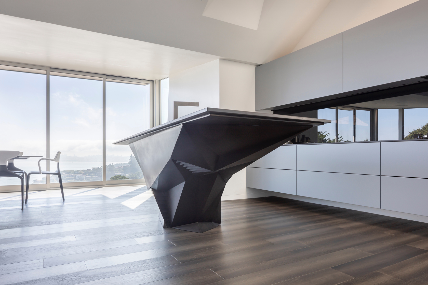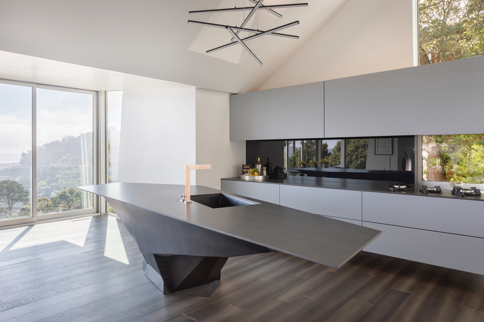 The second move was the kitchen. We opened it completely to the living room and the views. Every appliance hides away so the kitchen becomes part of the living space. The island became the centerpiece. It is a functional sculpture inspired by the owners’ Lamborghinis. Working with Wyatt Studios, we taped full size images of Lamborghinis on the shop wall and shaped the island from steel sheets using those lines as our reference.