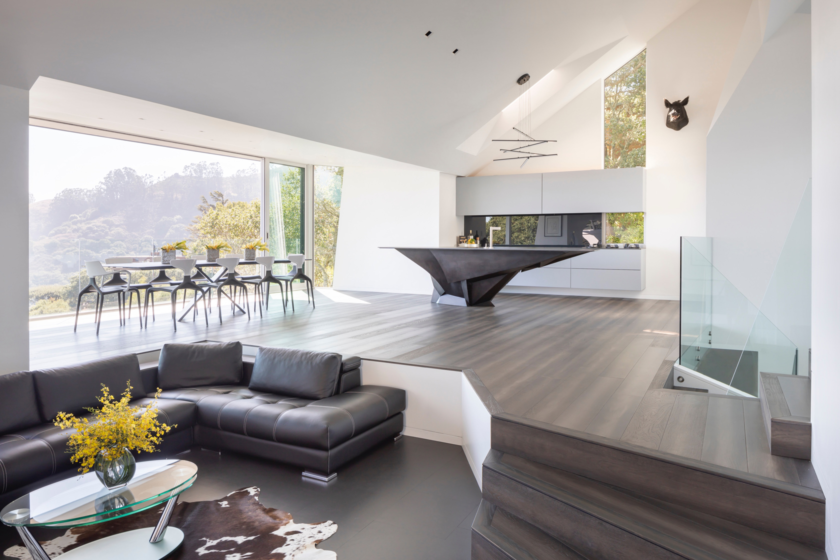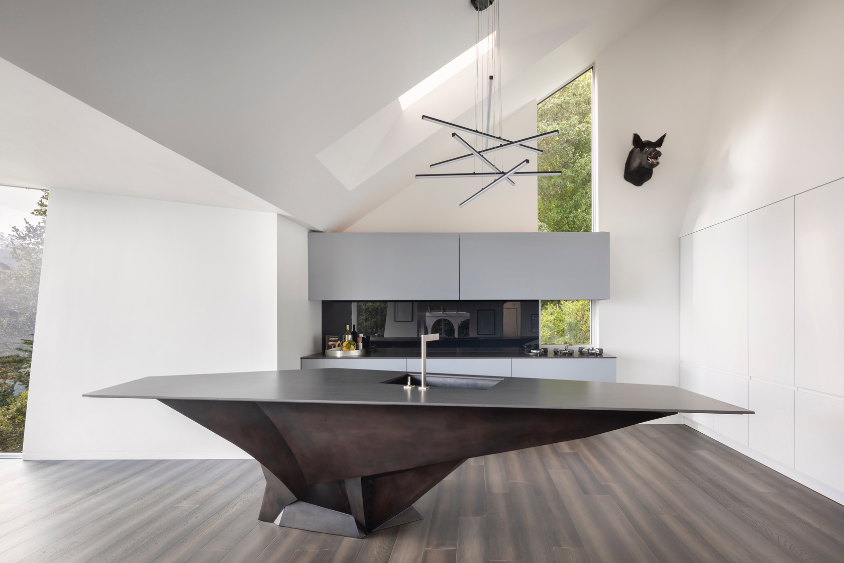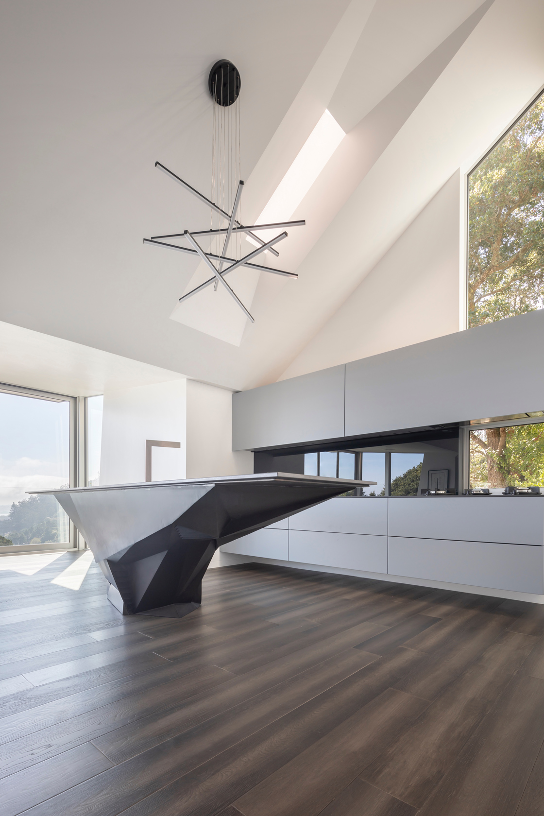 The second move was the kitchen. We opened it completely to the living room and the views. Every appliance hides away so the kitchen becomes part of the living space. The island became the centerpiece. It is a functional sculpture inspired by the owners’ Lamborghinis. Working with Wyatt Studios, we taped full size images of Lamborghinis on the shop wall and shaped the island from steel sheets using those lines as our reference.