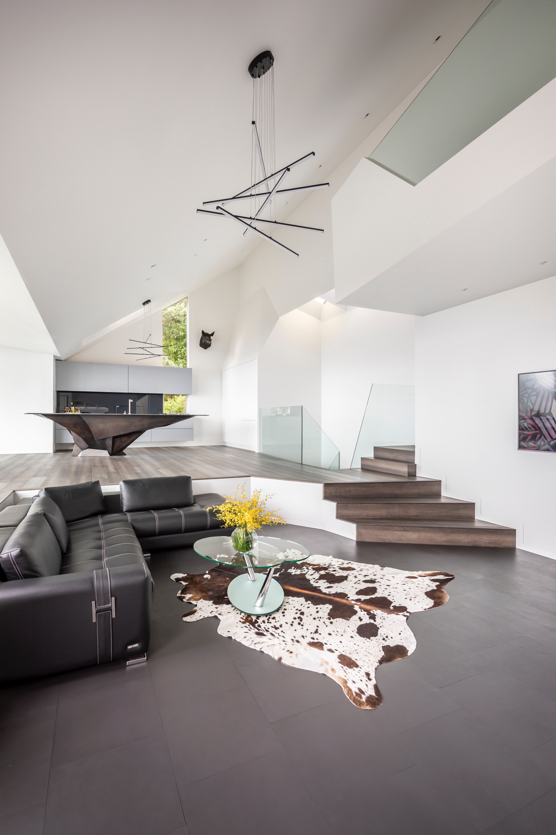 The island is not simply a kitchen element—it operates on three levels. It is practical and fully equipped, it anchors the living space as a social hub, and it exists as a piece of art in its own right. With concealed appliances and minimal surfaces, the kitchen disappears into the background, allowing the island’s sculptural presence to command the room.