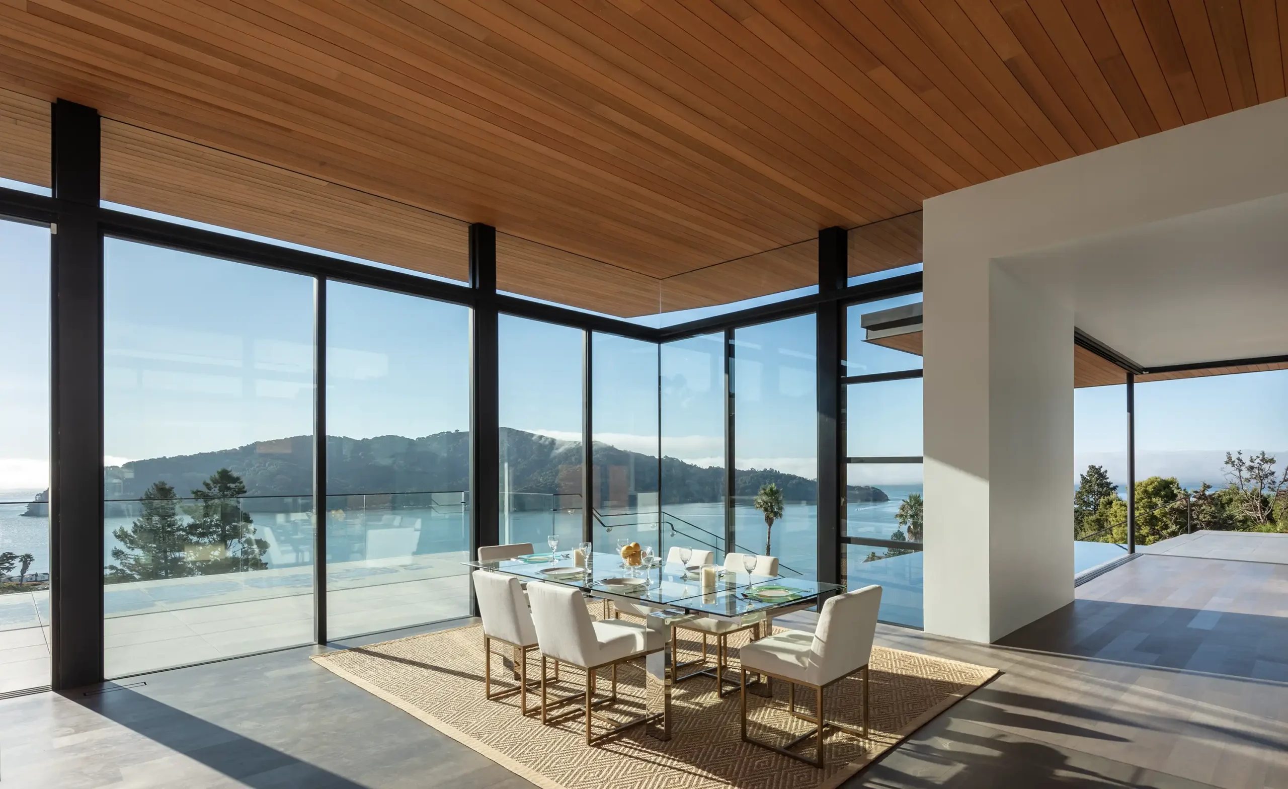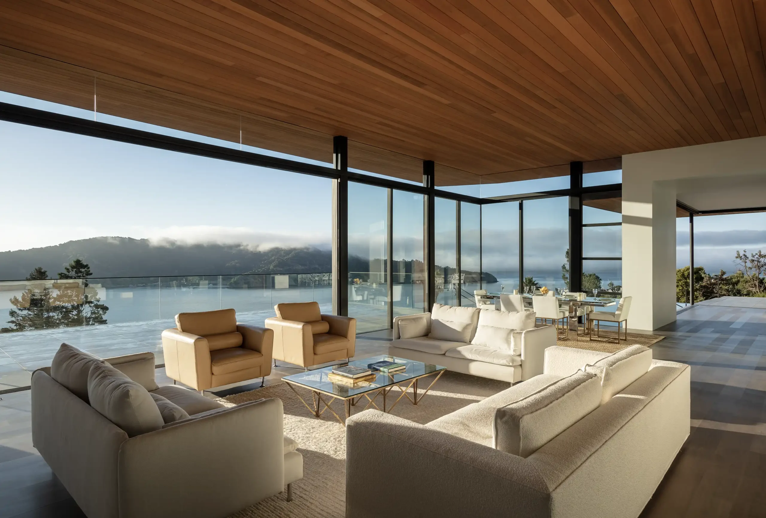 “Sleek lines, dramatic overhangs, soaring ceilings with warm wood finishes, and a grand scale open floorplan define the residence… One level living with a hotel like primary suite on the main floor and no stairs at the entrance… Magazine worthy design with reach out and touch views of both towers of the Golden Gate Bridge…”