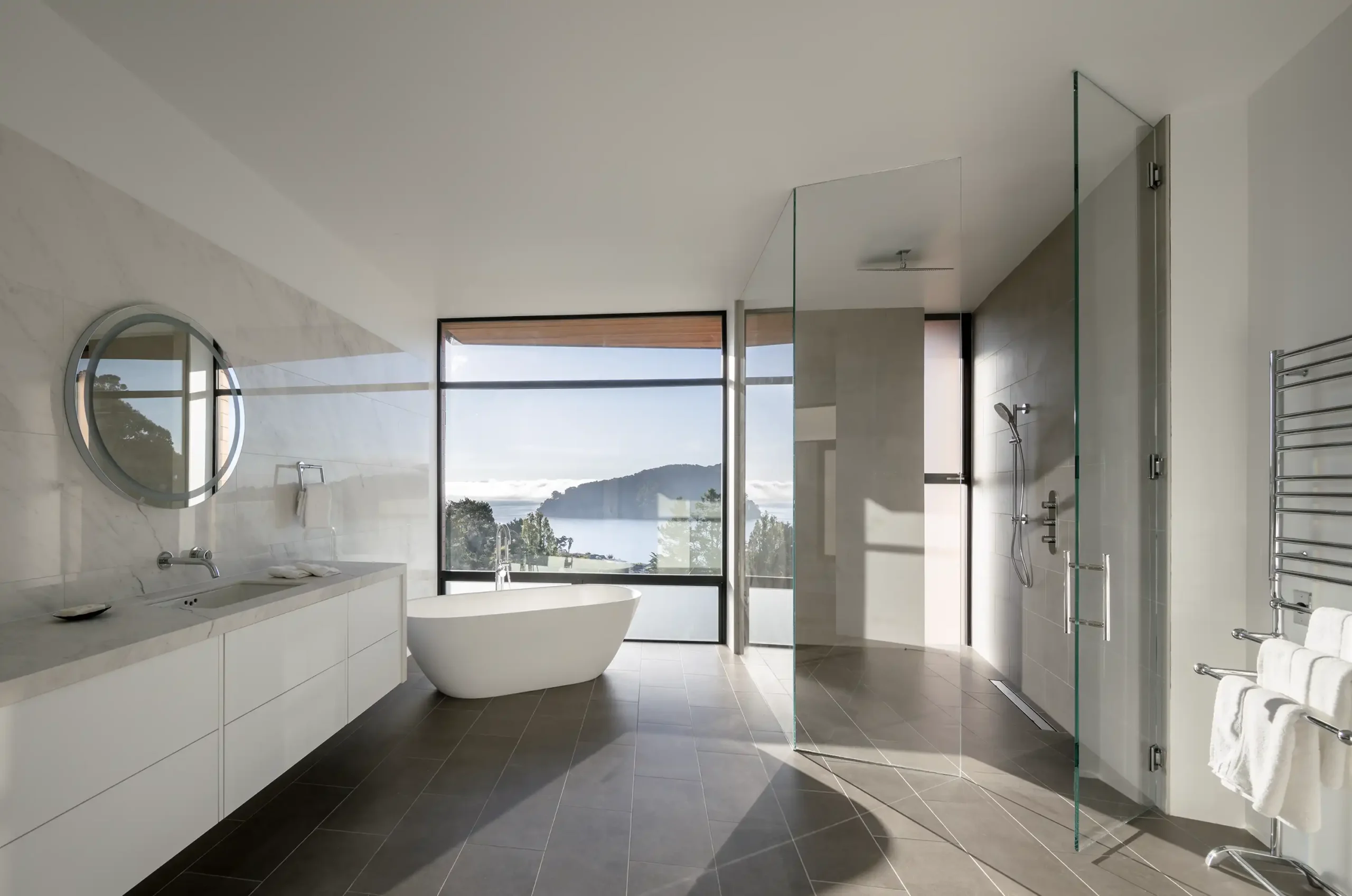 The finished house delivers exactly what we set out to create. Single level living on a steep site, wrapped in panoramic views, with fluid movement from interior to exterior.