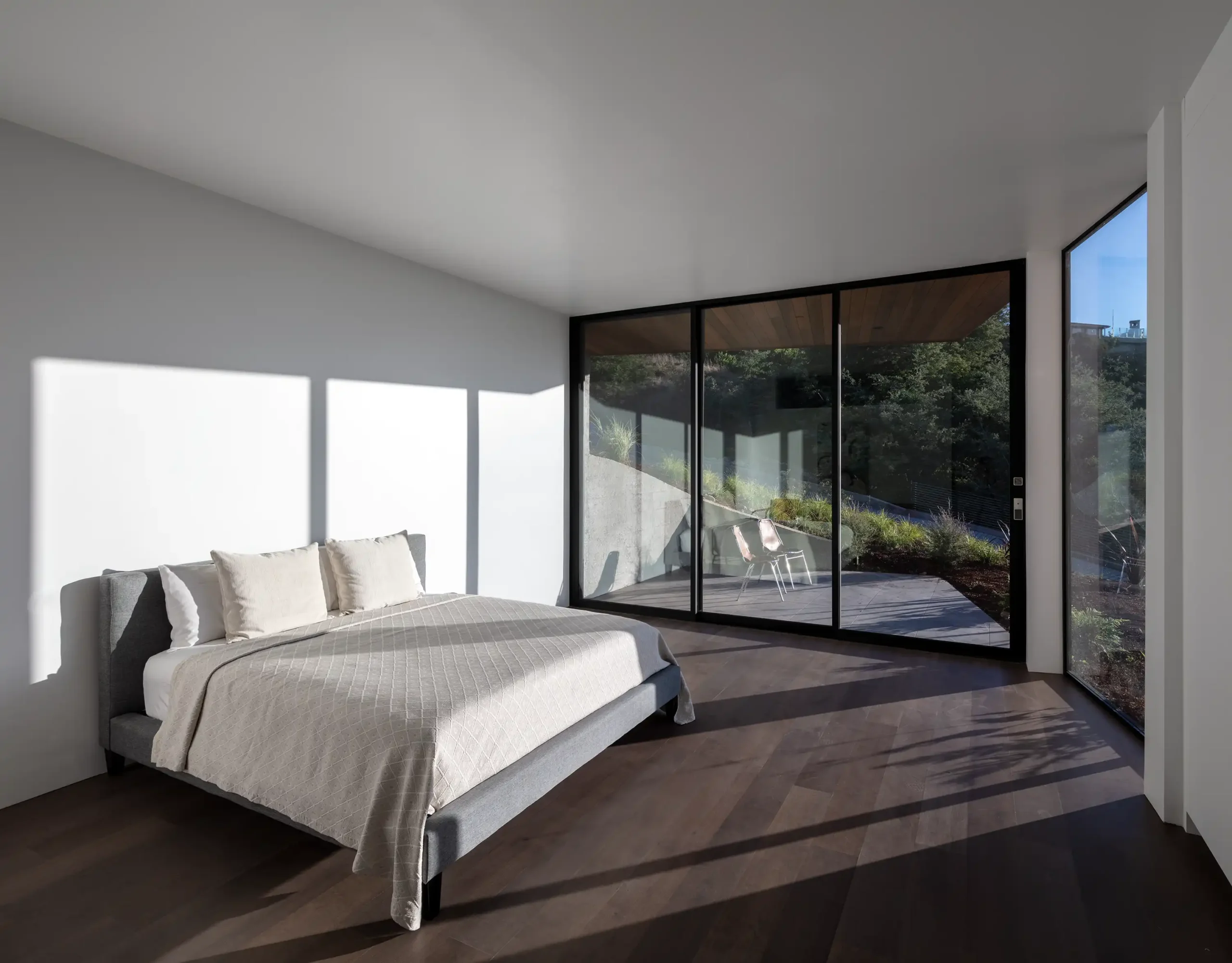 The completed home is organized as a series of quiet, horizontal volumes resting lightly on the hillside. The primary living spaces—entry, main living area, and primary suite—share one level, capturing panoramic views while offering an ease of movement typically impossible on steep terrain. Below, secondary living spaces open fully to level outdoor patios, reinforcing a seamless indoor–outdoor experience grounded in the geometry of the site.
