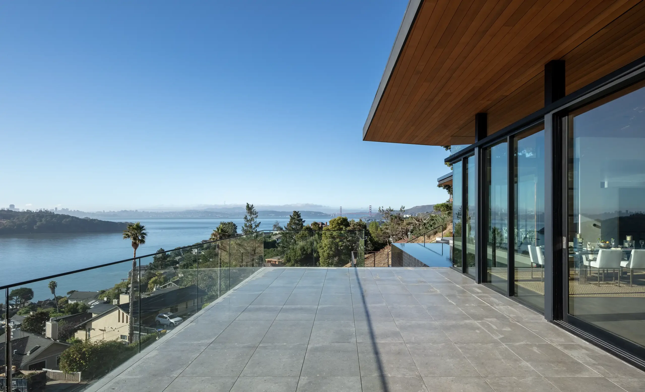 This project began with a site that had long resisted development. Perched on a steep upslope in Tiburon, the one-acre property offered commanding views of the Golden Gate Bridge, the San Francisco skyline, and open Bay water—but no viable way to reach them. For years, the absence of a workable driveway and emergency access made the site effectively unbuildable. Solving that constraint became the foundational move that unlocked the entire project.